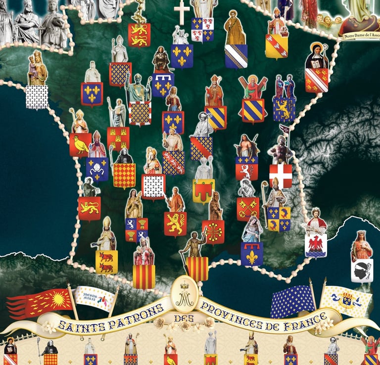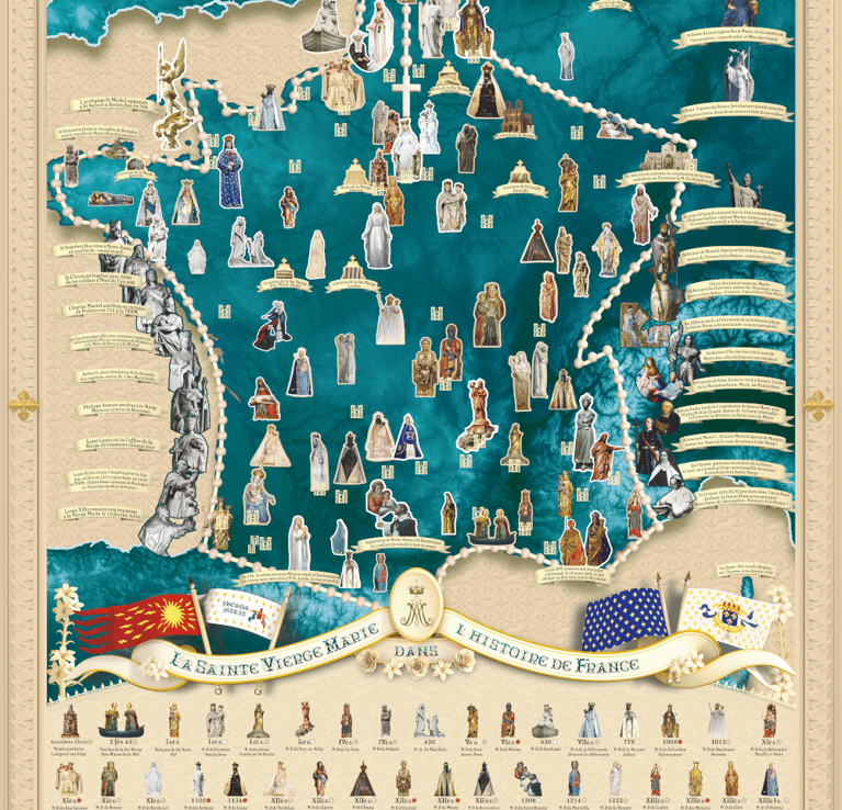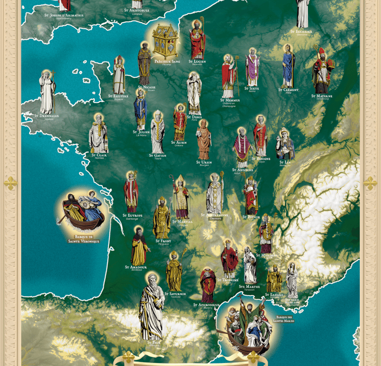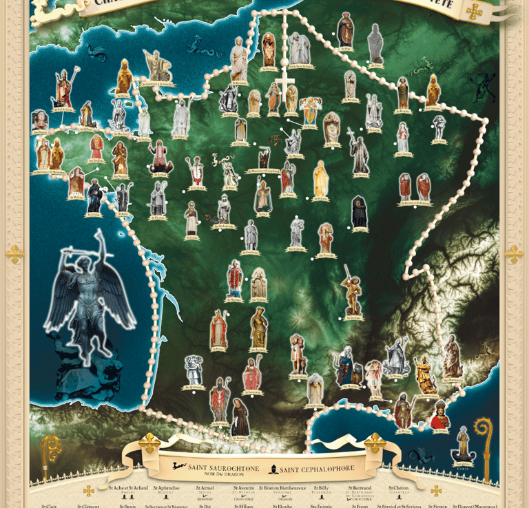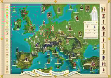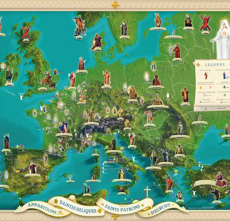 CARTE DE L'EUROPE CATHOLIQUE : RELIQUES DU CHRIST, APPARITIONS MARIALES, SAINTS PATRONS