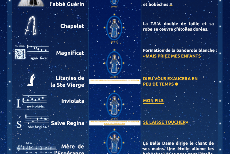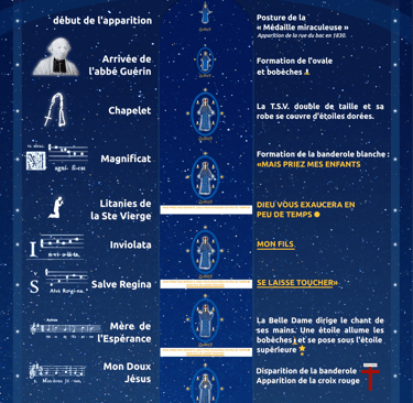 Infographie des étapes de l'apparition de Notre- Dame de Pontmain avec les correspondances des prières demandées par l'abbé Guérin aux personnes présentes.
