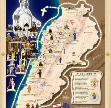 Cette carte présente les saints célèbres du Liban et les principaux sanctuaires maronites ! Ces chrétiens d'orient fidèles à la Papauté, ont traversé les siècles, souvent de très périlleuses situations grâce à l'intercession de Notre Dame et de grands saints peuplant la Vallée Sacrée.