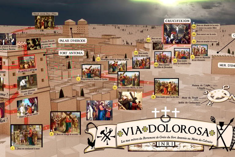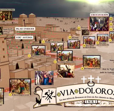 Infographie de la Via dolorosa dans la Jerusalem du 1er siècle, depuis le fort Antonia au Mont Calvaire.